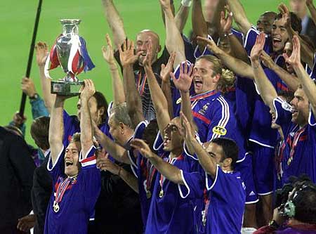 | Elöl a 101-szeres válogatott Deschamps a kupával, mögötte az Európa-bajnok Franciaország |
